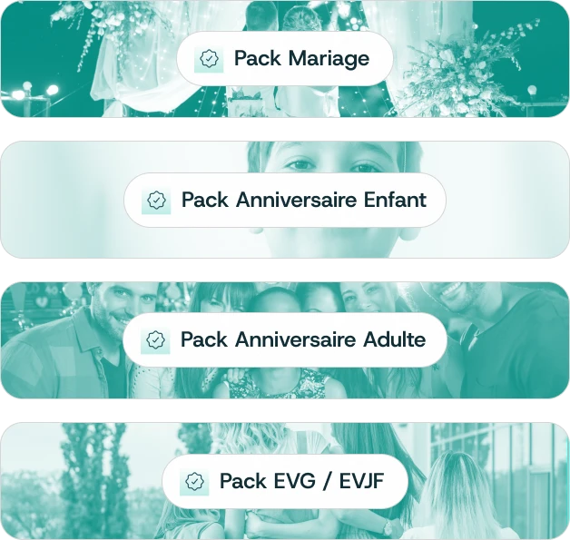 Location libre, pack clé en main ou événement sur-mesure : sélectionnez ce qui correspond le mieux à votre besoin.