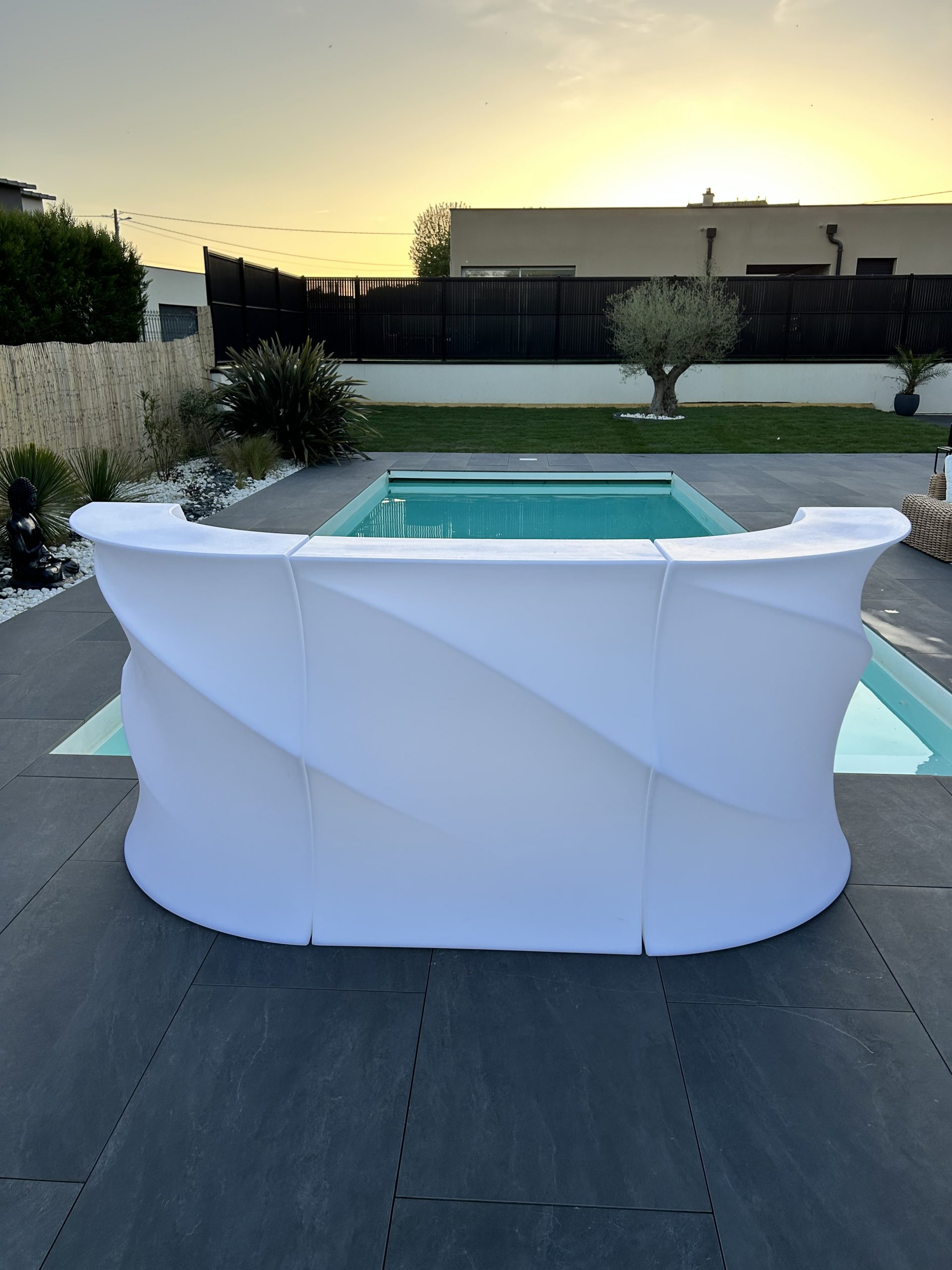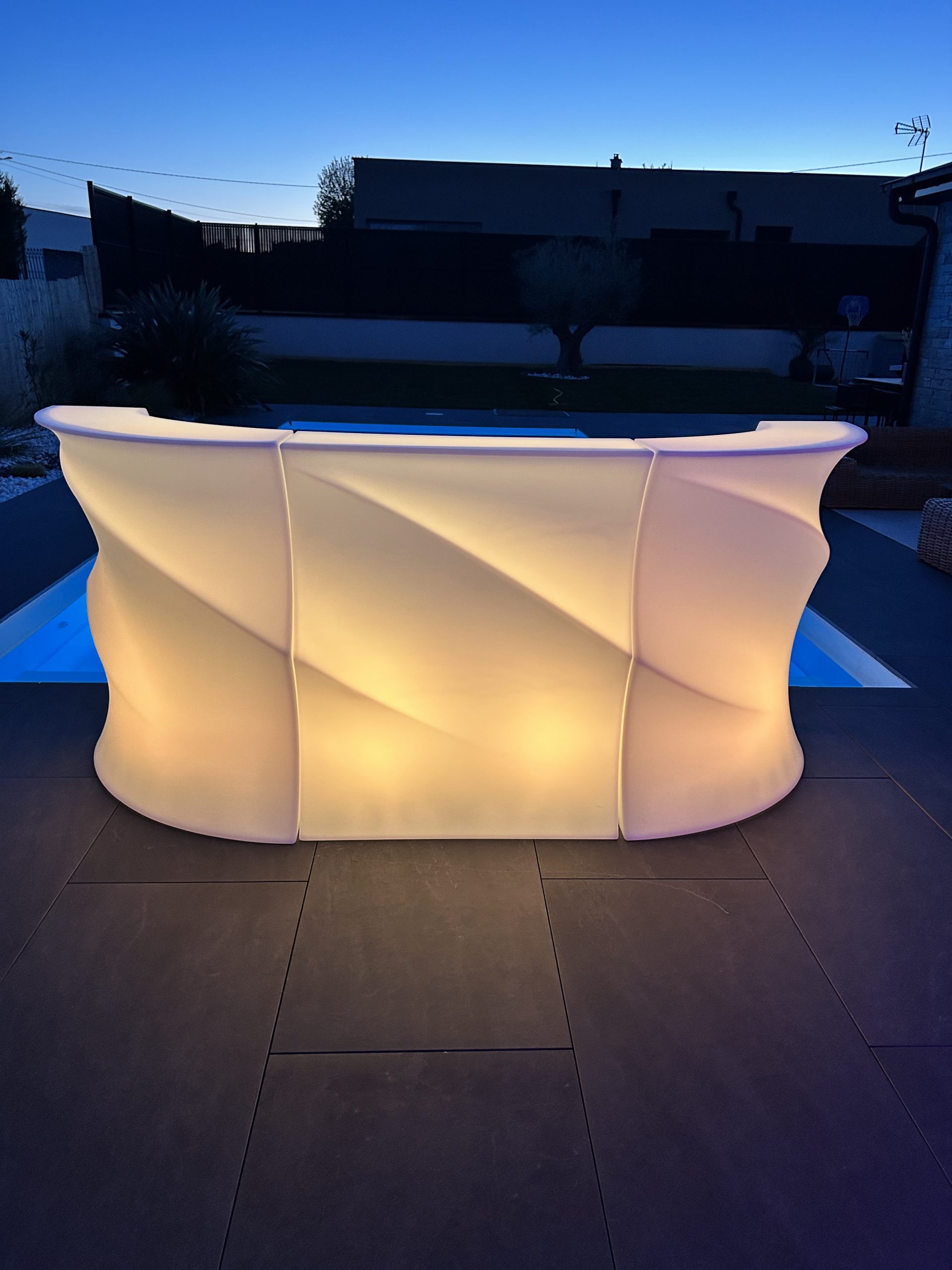 Le pack bar lumineux événementiel Trio permet de créer un bar avec des lignes fluides et arrondies, offrant une excellente visibilité et une circulation naturelle autour de l’espace bar. Cette configuration est particulièrement appréciée pour les bars en îlot, les espaces lounge ou les zones cocktail centrales.