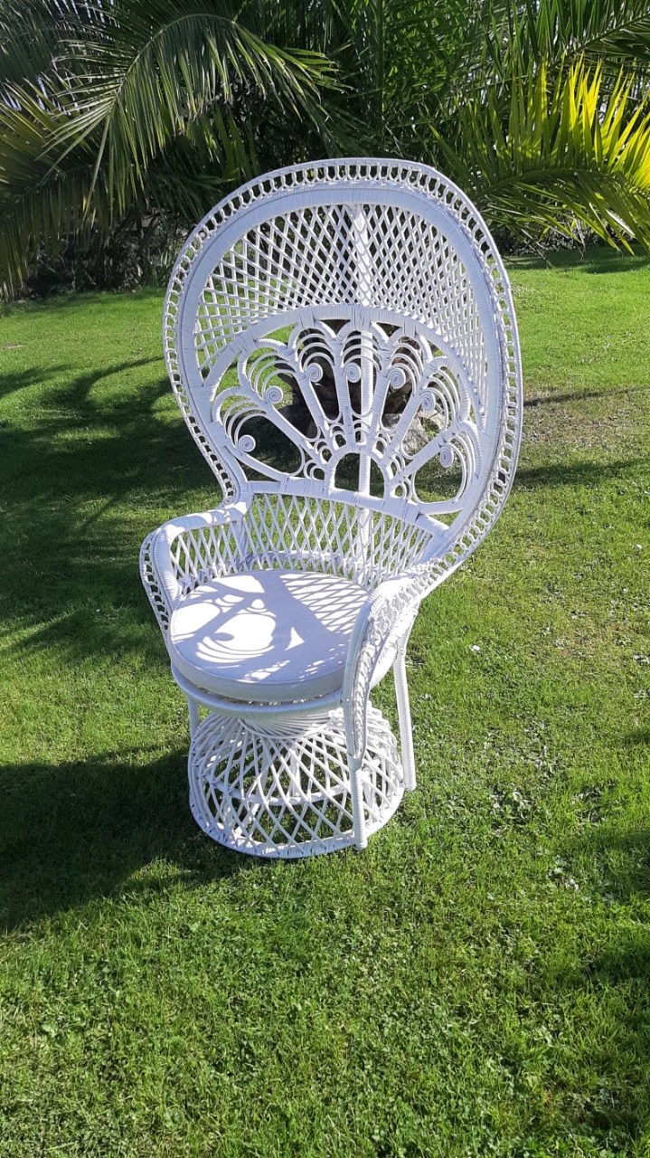 Ajoutez une touche bohème et élégante à votre décoration avec notre fauteuil en rotin blanc type « Emmanuelle ».
